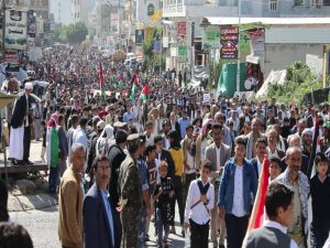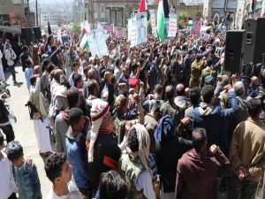 ورددت الحشود هتافات النصر والتضامن مع الشعب والمقاومة الفلسطينية، والتندبد بصمت المجتمع الدولي تجاه الإرهاب الصهيوأمريكي والمجازر الوحشية التي يرتكبها بحق أبناء فلسطين .. مجددين التأييد الكامل لكل القرارات التي يتخذها قائد الثورة السيد عبدالملك بدرالدين الحوثي لنصرة الشعب والمقاومة الفلسطينية.