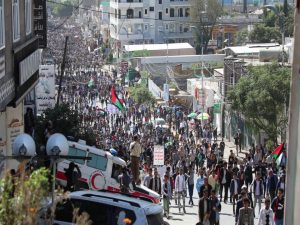 ورفعت الحشود في المسيرة، الأعلام الفلسطينية واللافتات والشعارات المؤيدة والداعمة لخيارات حركات الجهاد والمقاومة الباسلة .