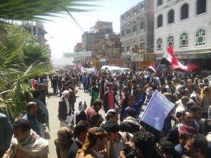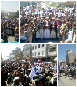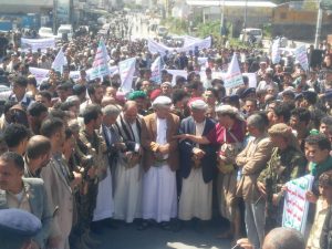 عقب ذلك توجه المشاركون في مسيرة حاشدة الى أمام المجلس المحلي للمحافظة وهم يرفعون اللافتات المنددة باستمرار العدوان والحرب الاقتصادية التي تشنها دول العدوان الأمريكي السعودي الإماراتي على شعبنا اليمني في محاولة بائسة لتركيع شعبنا وإخضاعه للوصاية والتبعية الخارجية.