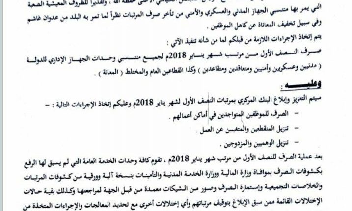 وتضمن الوثيقة صرف النصف الأول من مرتب شهر يناير لعام 2018 لجميه منتسبي الجهاز الإداري للدولة (مدنيين وعسكريين وأمنيين ومتعاقدين ومتقاعدين) وكذ القطاعين العام والمختلط (المعانة).