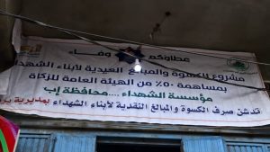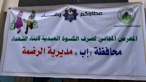 دشنت مؤسسة الشهداء بالتعاون مع هيئة الزكاة معرضين للكسوة العيدية لأبناء الشهداء الأبطال من منتسبي الجيش واللجان الشعبية في مديريتي يريم والرضمة بمحافظة إب الذين يستهدفان كسوة ( ٦٩١ ) من أبناء وبنات الشهداء في كلا المديريتين .