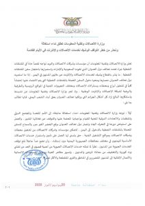 أولاً: توجه وزارة الاتصالات وتقنية المعلومات «نداء استغاثة عاجلة» إلى الأمم المتحدة والمجتمع الدولي والمنظمات والاتحادات الدولية المعنية للقيام بواجباتها المحتمة عليها والتوقف عن تخاذلها المشين، والعمل على استنهاض دورها في التحرك الجاد وإجبار دول تحالف العدوان على رفع الحظر غير المبرر والسماح للسفن المحملة بالمشتقات النفطية بالدخول إلى اليمن، لتتمكن مؤسسات وشركات الاتصالات من تشغيل المحطات والشبكات ومواقع التشغيل الفنية، حتى يتسنى لها العمل على تأمين واستمرار خدمات الاتصالات الأساسية لليمنيين في مختلف محافظات الجمهورية دون استثناء، وأن تضع حداً لمنع توقف الخدمات الحيوية عن المدنيين، نظراً لما تمثله خدمات الاتصالات الحيوية من أهمية قصوى في الحد من تفشي وباء كورونا والتخفيف من معاناة المرضى والمدنيين، وتسيير مظاهر الحياة ووصول المساعدات الإنسانية والأعمال الإغاثية إلى المدنيين المتضررين في المناطق والقرى المتقطعة والأكثر تضرراً.
