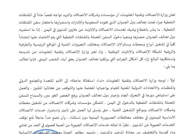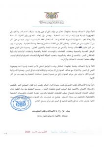 ثانياً: وزارة الاتصالات وتقنية المعلومات تحذر من توقف كلي أو جزئي وشيك لشبكات الاتصالات والإنترنت في الجمهورية اليمنية جراء انعدام المشتقات النفطية، وتحمل دول تحالف العدوان وكل الأطراف الداعمة والمتواطئة معها، المسؤولية القانونية الكاملة إزاءها، كما تحملها كافة التبعات وما سيترتب عليه من عزل أكثر من 27 مليون مواطن عن العالم، وتعطيل أكثر من 1.842 مستشفى وجامعة ومنشأة تعليمية، وحرمان ما يزيد عن مليوني طالب وباحث وأكاديمي من خدمات البحث والتطوير العلمي، وحدوث شلل تام في جميع المرافق الخدمية والصحية ومختلف القطاعات والمؤسسات العامة والخاصة والمنظمات الإنسانية والدولية العاملة في اليمن، والتسبب في تفاقم وباء كورونا، وتجميد الحركة التجارية والخدمات المصرفية والبنكية بسبب توقف محتمل لخدمات الاتصالات والإنترنت.