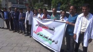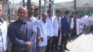 نظم العاملون والكوادر الطبية بهيئة مستشفى الثورة العام في محافظة إب اليوم وقفة احتجاجية رافضة للتطبيع الإماراتي مع الكيان الصهيوني .