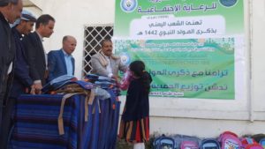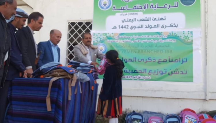 دشنت الجمعية الخيرية للرعاية الاجتماعية بمحافظة إب بالتنسيق مع المجلس اﻷعلى للشئون اﻹجتماعية بالمحافظة اليوم .. مشروع توزيع الحقيبة المدرسية للأيتام وأبناء الشهداء، إحتفاءا بذكرى المولد النبوي الشريف على صاحبه أفضل الصلاة وأتم التسليم .