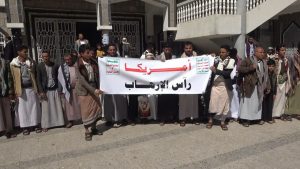وفي الوقفة التي نظمت تحت شعار ( أمريكا أم الإرهاب ) أعلن المشاركون رفضهم لقرار تلك الإدارة بتصنيف أنصار الله حركة إرهابية .. معتبرين في بيان وقفتهم أن هذا القرار الغير مستغرب من نظام عدو يعد استهداف لكل أبناء هذا الشعب وسعيا لإفشال أي مساع للمصالحة والحوار وإيقاف العدوان .