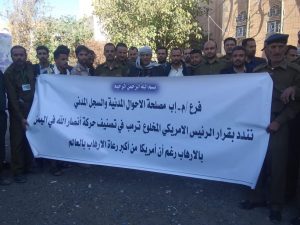 أقيمت في المركز الثقافي بمحافظة إب وقفة شاركت فيها عدد من المكاتب التنفيذية تنديدا بقرار النظام الأمريكي تصنيف أنصار الله كحركة إرهابية .