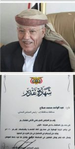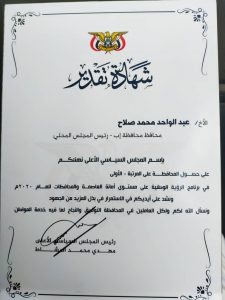 منح فخامة رئيس المجلس السياسي الأعلى مهدي المشاط اليوم شهادة تقدير  لمحافظ إب عبدالواحد محمد صلاح بعد أن حازت محافظة إب على المرتبة الأولي بين المحافظات للعام الماضي 2020 في برنامج الرؤية الوطنية .