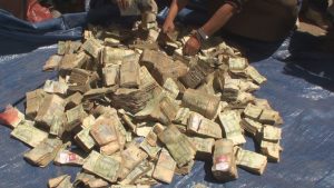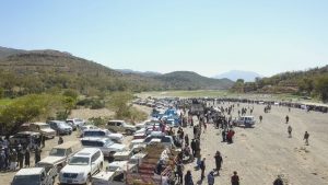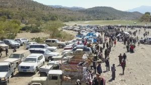 وتضمنت القافلة مبلغ مالي يزيد عن (٦٠) مليون ريال بالإضافة إلى العشرات من السيارات المحملة بالمواد الغذائية والمواشي .