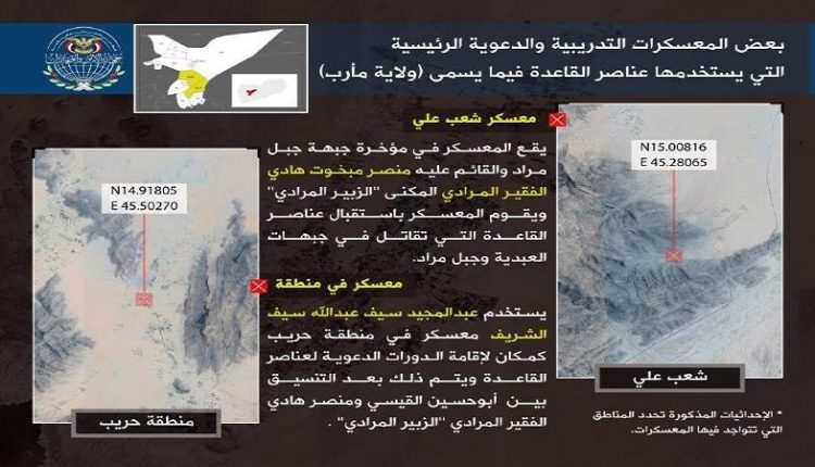 ولفت إلى أن معسكر منطقة حريب” يستخدمه التنظيم لإقامة الدورات الدعوية لعناصر “القاعدة”، مشيرا إلى أن “القاعدة” تمتلك 5 مخازن أسلحة في مناطق: الخثلة الفقراء، مزرعة القيادي رائد بن معيلي بمنطقة العرق، منزل القيادي “معاذ الصنعاني” في الحدد، منزل “خالد العرادة” في كرا، ومنزل القيادي “أبو عمار الجهمي”.
