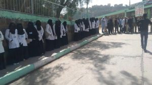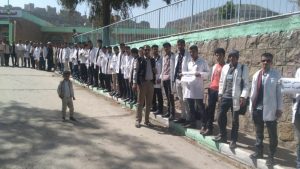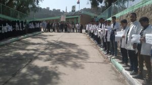 نظم كوادر واطباء مستشفى الشهيد علي عبدالمغني بمديرية السدة محافظة إب وقفة احتجاجية تنديدا باستمرار الحصار واحتجاز سفن المشتقات النفطية .
