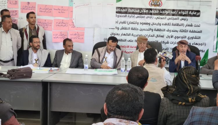 أقيمت اليوم في مديرية الظهار بمحافظة إب ورشة عمل حول دور الوجهاء وعقال الحارات في إيجاد بيئة نظيفة ، نظمتها المنطقة الثالثة في صندوق النظافة بالشراكة مع اللجنة المجتمعية وهيئة حماية البيئة وجمعية البيئة والتنمية ، تحت عنوان ( النظافة ثقافة إيمان .. صمود وانتصار ) .