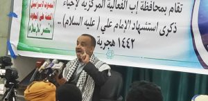وكان الشيخ فيصل العدلة قد ألقى كلمة باسم الجانب الثقافي أوجز فيها سيرة الإمام علي ومكانته وصفاته ودوره في خدمة الدين .. موضحا أن هذه الذكرى تمثل حزنا سيظل قائما لكل أبناء الدين الإسلامي حتى قيام الساعة..