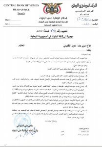 أصدر البنك المركزي اليمني، تعميمين إلى كافة البنوك وشركات الصرافة في الجمهورية اليمنية بشأن الحملة الشعبية لدعم الشعب الفلسطيني الشقيق “حملة القدس أقرب”.