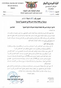تعميم رقم (66) لسنة 2021م موجه إلى كافة شركات الصرافة في الجمهورية اليمنية: