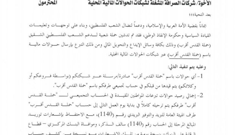 1- أي حوالات باسم “حملة القدس أقرب” صادرة/ مرسلة عبر شبكتكم (بواسطة فروعكم أو وكلائكم) يتم قيدها من قبلكم في حساب تجميعي طرفكم باسم ” حملة القدس أقرب”.