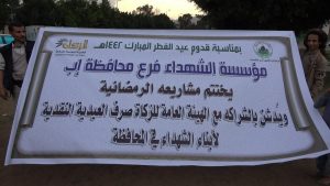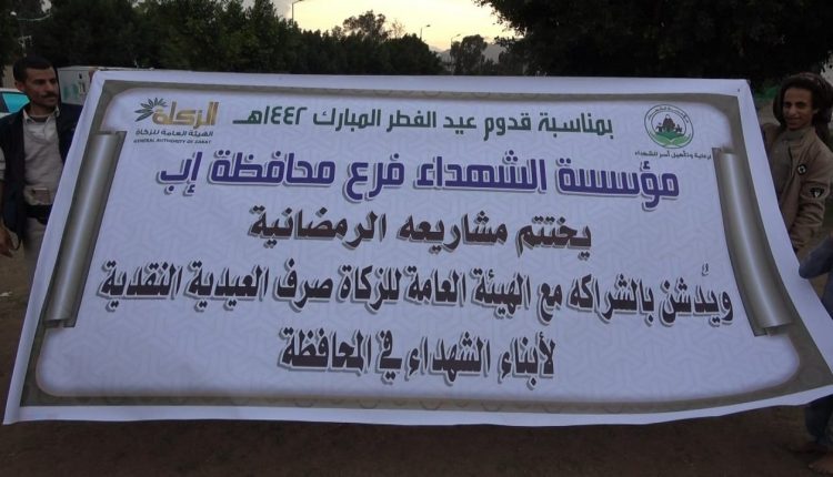 دشنت مؤسسة الشهداء فرع محافظة إب بالتعاون مع هيئة الزكاة مشروع العيدية النقدية لأبناء الشهداء بالمحافظة ، حيث يستهدف هذا المشروع ما يزيد عن ألفين وثمانمائة طفل وطفلة من أبناء الشهداء في كافة مديريات المحافظة .