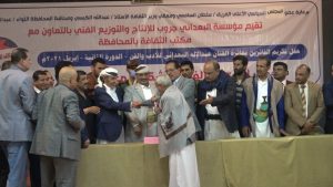 وفي ختام الفعالية التكريمية التي تخللها قصيدتان للشاعر أحمد إلياس الحائزة قصيدته على المركز الأول ، والشاعرة إيمان السعيدي التي حائزة قصيدتها على المركز الخامس .. تم تكريم الفائزين في المسابقة في حقل الشعر لعدد خمسة شغراء، والفائزين في حقل الفن التشكيلي لعد خمسة فنانين تشكيليين.. وكذا تكريم لجان التحكيم واﻹعداد واﻹشراف والتنظيم ، وتقديم جوائز نشجيعية لعدد (20) فنانا و(30) شاعرا من كلا الجنسين بقيمة مليون و900 ألف ريال .