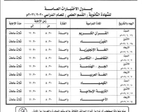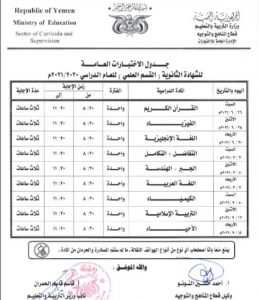 أعلنت وزارة التربية والتعليم في حكومة صنعاء , السبت , جدول سير الاختبارات النهائية للشهادة العامة للمرحلتين الأساسية والثانوية بقسميها العلمي والأدبي للعام الدراسي ٢٠٢٠/ ٢٠٢١م .