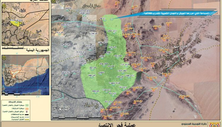 خريطة توضح المساحة المحررة في #عملية_فجر_الانتصار في محافظة مأرب والتي تكللت بفضل الله بالنجاح وتم تطهير اكثر من 600 كلم٢