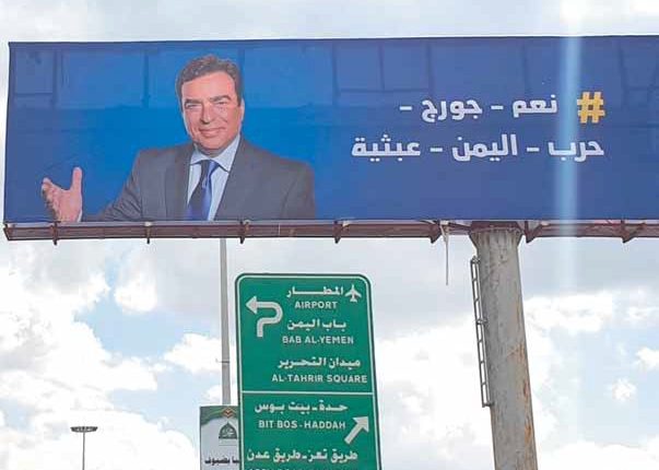 لوحات عملاقة في صنعاء لصور وزير الإعلام اللبناني جورج قرداحي «نعم جورج.. الحرب على اليمن عبثية»