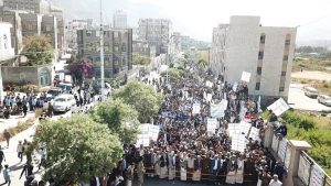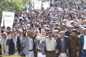 ورفع المشاركون في المسيرة الشعارات المنددة بالدور الأمريكي تجاه أبناء الشعب اليمني، وأكدوا المضي في مواجهة قوى العدوان ورفد الجبهات حتى تحقيق النصر.