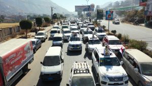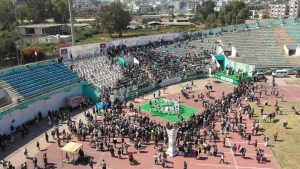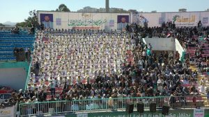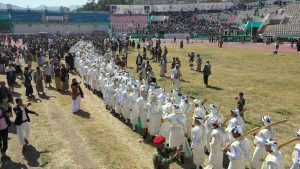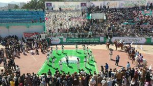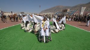 ،،،هذا وجاب موكب العرس الجماعي شوارع مدينة إب وسط اهازيج وتفاعل شعبي واسع ليستقر الموكب المهيب في الاستاد الرياضي الذي شهد اقامة فقرات المهرجان الكبير ..