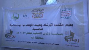 نظم اليوم مكتب الإرشاد وفرع هيئة الأوقاف بمحافظة إب اليوم، فعالية خطابية وثقافية إحياءً للذكرى السنوية للشهيد 1443 هجرية .