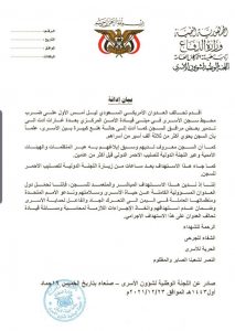 أدن بيان صادر عن اللجنة الوطنية لشؤون الأسرى اليوم الخميس استهداف طيران العدوان لمحيط سجن الأسرى بمبنى قيادة الأمن المركزي بالعاصمة ليلة أمس ما ادى إلى تضرر وتدمير بعض اجزاء السجن. وأكدت أن السجن يحوي ثلاثة الف أسير، وان السجن معروف لديهم وسبق ابلاغهم عن طريق منظمات الأمم المتحدة قبل أكثر من عامين. وحمل البيان قوى العدوان عن سلامة وحياة الأسرى. a href=”https://www.ibb-news.com/wp-content/uploads/2021/12/IMG_20211223_151756_618.jpg”>