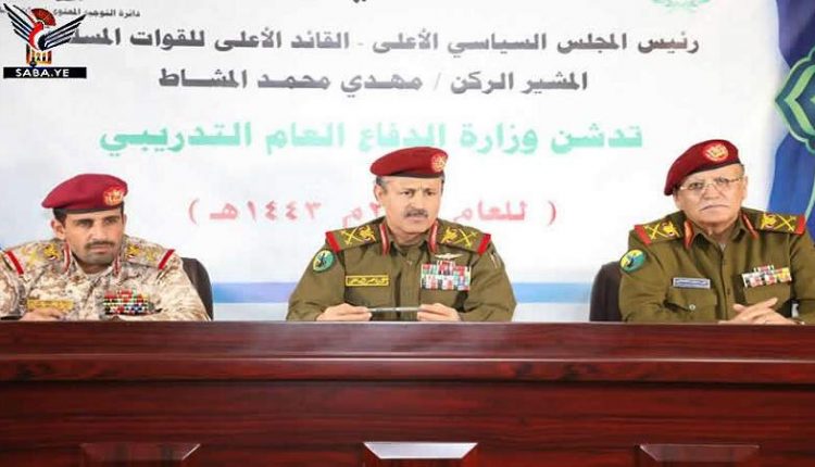 دشن وزير الدفاع اللواء الركن محمد ناصر العاطفي ورئيس هيئة الأركان العامة اللواء الركن محمد عبدالكريم الغماري اليوم في صنعاء فعاليات العام التدريبي والعملياتي والقتالي 2022م.