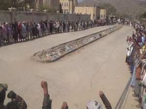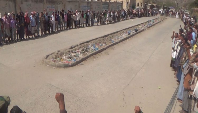وخلال الوقفة التي حضرها وكيلا المحافظة حارث المليكي وجمال الحميري ، أعلن المشاركون تدشين مرحلة جديدة من مراحل التعبئة العامة ورفد الجبهات ضمن حملة إعصار اليمن التي دشنتها القيادة السياسية ممثلةً بالمشير مهدي المشاط رئيس المجلس السياسي الأعلى ..