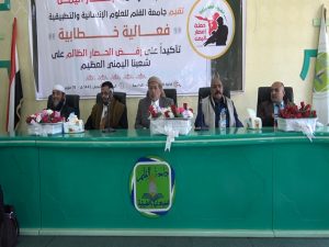 نظمت اليوم جامعة القلم للعلوم اﻹنسانية والتطبيقية بمحافظة ، فعالية خطابية تأكيدا على رفض الحصار الظالم على الشعب اليمني ودعماً لحملة اعصار اليمن للحشد والإستنفار ..