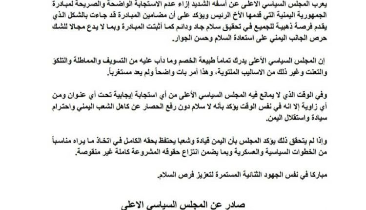 يعرب المجلس السياسي الاعلى عن أسفه الشديد إزاء عدم الاستجابة الواضحة والصريحة لمبادرة الجمهورية اليمنية التي قدمها الأخ الرئيس ويؤكد على أن مضامين المبادرة قد جاءت بالشكل الذي يقدم فرصة ذهبية للجميع في تحقيق سلام جاد ودائم كما أثبتت المبادرة وبما لا يدع مجالا للشك حرص الجانب اليمني على استعادة السلام وحسن الجوار.
