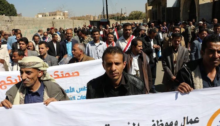 تحت شعار “ادفعوا مرتباتنا يا أعداء الشعوب”.. موظفو الدولة يتظاهرون أمام مبنى الأمم المتحدة في صنعاء للمطالبة بدفع رواتبهم