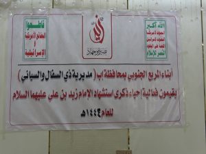 أقيمت في المربع الجنوبي مديريتي ذي السفال والسياني بمحافظة إب، فعالية خطابية وثقافية إحياءً لذكرى استشهاد الإمام زيد عليه السلام.