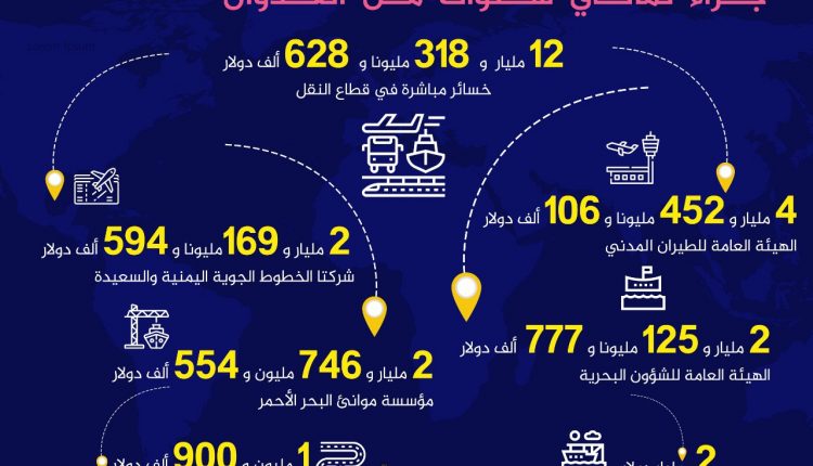وبلغت “خسائر شركتي الخطوط الجوية اليمنية والسعيدة جراء الحرب والحصار مليارين و١٦٩ ومليون و ٥٩٤ ألف دولار، فيما وصلت خسائر مؤسسة موانئ البحر الأحمر مليارين و٧٤٦ مليون و٥٥٤ألف دولار”.