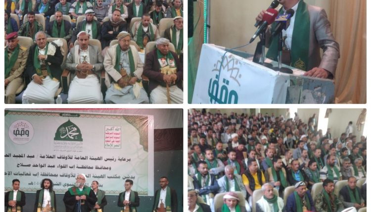 وأشار الى تزامن هذه المناسبة مع ما تحقق لشعبنا اليمني من انتصارات وانجازات نوعية في مختلف المجالات ومنها ما تحقق لقطاع اﻷوقاف بالمحافظة من مشاريع خدمية وإنسانية استهدفت تقديم المساعدات العينية والنقدية للفقراء والمحتاجين واﻷيتام ومرضى السرطان، وصرف مقررات المساجد واﻹعاشة، والاهتمام ببيوت الله وترمميمها وتزيينها بما يليق بعظمة ومكانة الرسول اﻷعظم في قلوب اليمنيين.