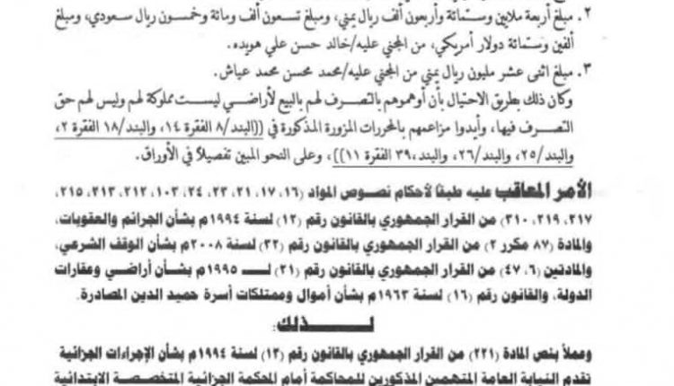 واكدت النيابة الجزائية المتخصصة في تقرير اتهامها أن الأمر المعاقب عليه طبقا لأحكام نصوص المواد ( 16-17-21- 23-24-103-212-213-215-217-219-310) من القرار الجمهوري بالقانون رقم ( ١٢ ) لسنة 1994م .بشأن الجرائم والعقوبات، والمادة ( ٨٧ مكرر²)من القرار الجمهوري بالقانون رقم ( ٣٢ ) لسنة 2008م بشأن الوقف الشرعي .المادتين ( ٦ ، ٤٧ ) من القرار الجمهوري بالقانون رقم ( ٢١ ) لسنة 1995 م . بشأن أراضي وعقارات الدولة، والقانون رقم ( ١٦ )لسنة 1963 م بشأن أموال وممتلكات أسرة حميد الدين المصادرة وانه وعملا بنص المادة ( ٢٢١ )من القرار الجمهوري بالقانون رقم ( ١٣ ) لسنة 1994 م .بشأن الإجراءات الجزائية .