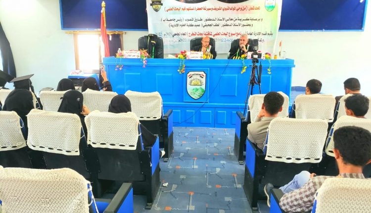 دشن رئيس جامعة إب فعاليات أسبوع البحث العلمي لمناقشة أبحاث تخرج طلبة قسم الإدارة العامة بكلية العلوم الإدارية للعام الجامعي 2021-2022