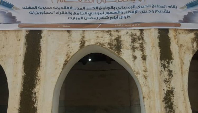 دشنت الهيئة العامة للأوقاف بمحافظة إب المطبخ الخيري في الجامع الكبير بمدينة إب القديمة مديرية المشنة والذي يستمر المطبخ خلال شهر رمضان المبارك في تقديم وجبتي الإفطار والسحور ضمن المرحلة الرابعة من مشروع (ويطعمون الطعام) بتكلفة 10 مليون ريال .