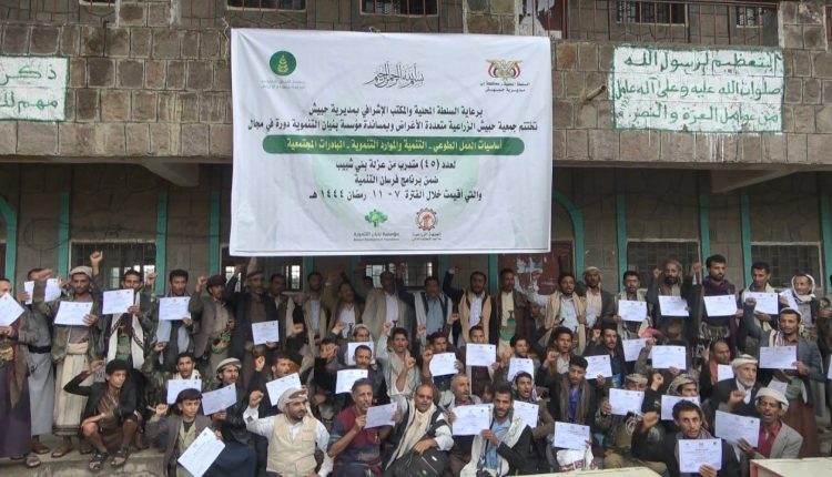 وخلال اختتام الدورة التي نظمتها على مدى خمسة ايام جمعية حبيش التتاونية الزراعية بالتعاون مع السلطة المحلية ومؤسسة بنيان التنموية .. أكد مدير عام المديرية محمد الفرح ومدير عام الوحدة الزراعية بالمحافظة يحيى الرميشي، اهمية تفعيل العمل الطوعي والمستدام في المجال الزراعي ومساعدة المزراعين في عملية التوعية وتشجيع الناس إلى الإتجاه نحو الزراعية لتحقيق الإكتفاء الذاتي .. مشيدين بتفاعل المجتمع في هذه المديرية خاصة عزلة بني شبيب في الإهتمام بالزراعة والمشاركة الجيدة في البرامج والأنشطة الزراعية ..