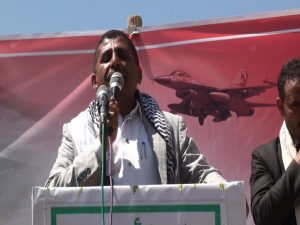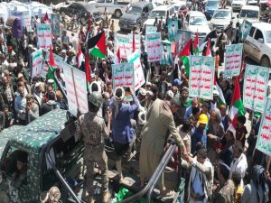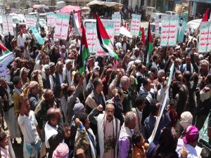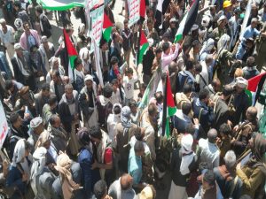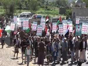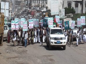 وفي المسيرة التي تقدمها وكيل المحافظة علي بن علي النوعة وانطلقت من الشارع العام بالمدينة إلى مفرق ذي السفال، ردد المشاركون هتافات النصرةً والتأييد للشعب والمقاومة في أرض فلسطين ورفعوا الشعارات المعادية لأمريكا وإسرائيل ..