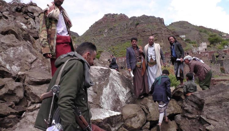 النقيب والتويتي والرميشي يطلعون على حجم الانهيارات الصخرية في قرية العشة عزلة اعماد وقطع طرق بني مسلم وبني عمر وخودان بمديرية يريم