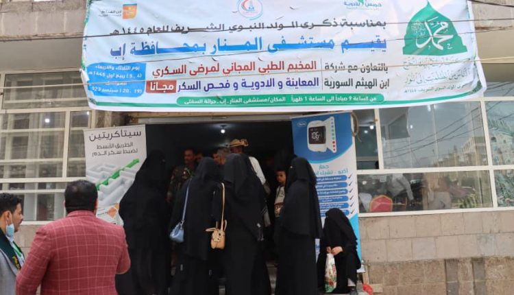 أختتمت إدارة مستشفى المنار إب مساء اليوم بالشراكة مع شركة خميس ( إبن الهيثم السورية ) ومؤسسة بايولاب للأدوية والمستلزمات الطبية المخيم الطبي المجاني لمرضى السكري بمناسبة ذكرى المولد النبوي الشريف ويهدف المخيم إلى تقديم الرعاية الصحية لمرضى السكري وتعزيز الوعي بأهمية السيطرة على هذا المرض المزمن.