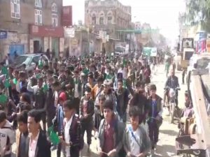 وخلال المسيرة نوه وزير التعليم العالي والبحث العلمي حسين حازب  إلى أن الشعب اليمني يحتفي بهذه المناسبة الدينية وهو يواجه بكل عزيمة وقوة عدواناً وحصاراً منذ نحو تسع سنوات، لنصرة رسول الله والمقدسات الإسلامية التي تتعرض للإساءة من قبل أعداء الأمة.