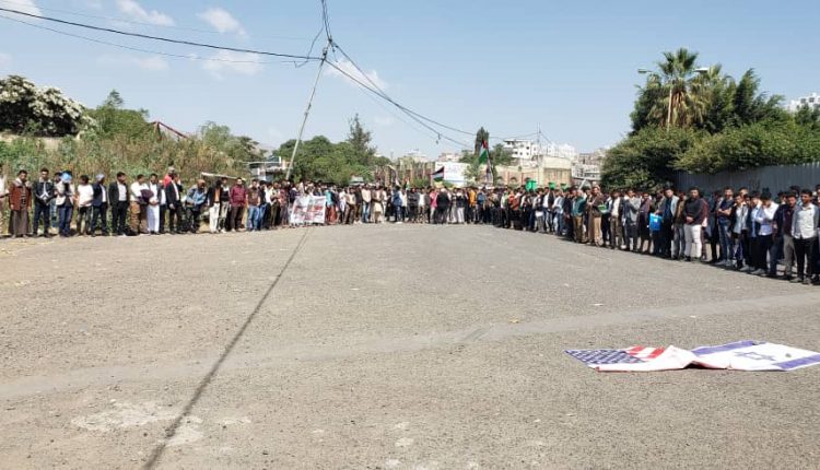 وقفة حاشدة بجامعة إب تنديدا بجرائم الكيان الصهيوني الغاشم