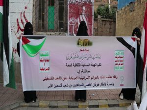 نظمت الهيئة النسائية الثقافية العامة بمحافظة إب، وقفة احتجاجية، تنديداً بجرائم الكيان الصهيوني الغاصب بحق أبناء الشعب الفلسطيني ونصرة لعملية طوفان الأقصى.