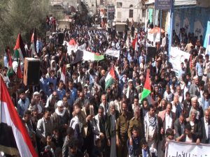 وردد المشاركون هتافات التفويض لقيادة الثورة بتنفيذ كافة الخيارات المناسبة لدعم الشعب والمقاومة الفلسطينية واستمرار قصف الأهداف والمصالح الصهيونية سواءً في الاراضي المحتلة او في السفن العابرة في البحرين الاحمر والعربي وخليج عدن ..