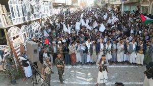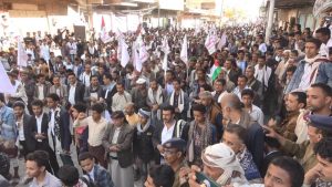 وعبر المشاركون في المسيرة عن الفخر والإعتزاز بذلك الموقف العظيم للقيادة الثورية ممثلة بالسيد عبدالملك بدر الد ين الحو ثي مع إخواننا في فلسطين الذين يتعرضون لابشع صنوف العذاب والقتل والإرهاب الصهيوني المدعوم امريكا ..