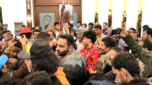 وعبر المحافظ صلاح عن بالغ الفخر والإعتزاز بذلك المستوى الرائع والأداء المتميز الذي قدمه المنتخب واستحق بجدارة الحفاظ على لقب بطل ابطال غرب اسيا .. مؤكدا ان أحداث فلسطين وما يتعرض له أخواننا في غزة كان حاضرا في وجدان لاعبي المنتخب من اول مباراة حتى تكريمهم بالكأس وهذا ليس بغريب على هذا الشعب وقيادته الثورية التي جسدت موقفها القوي قولا وعملا مع الشعب الفلسطيني وعمدت ذلك الموقف بالدم ..